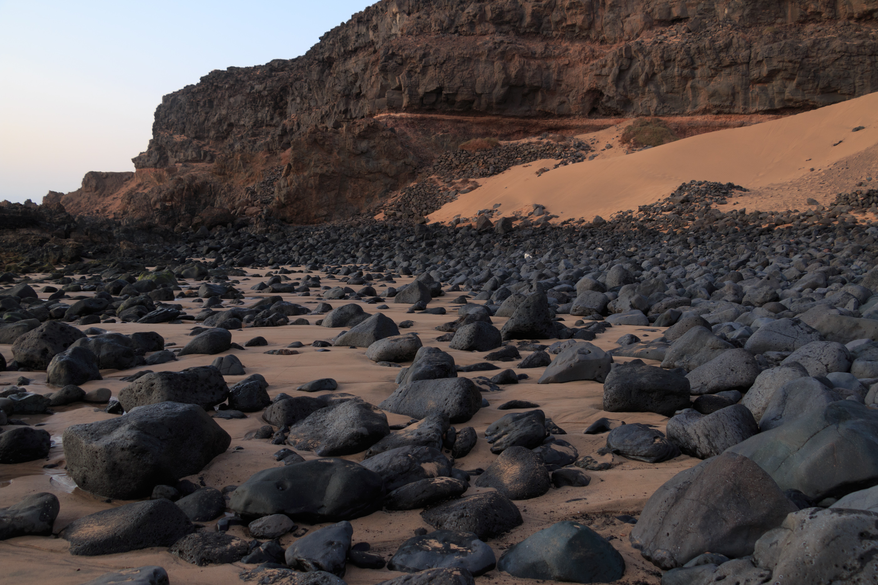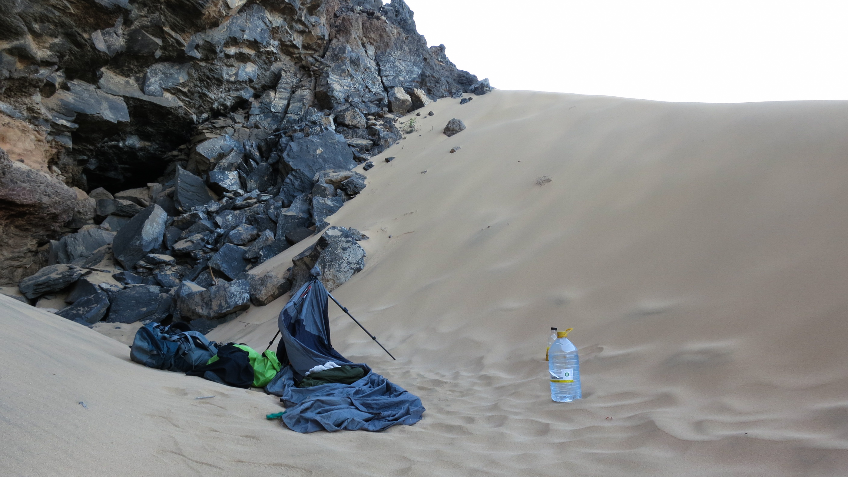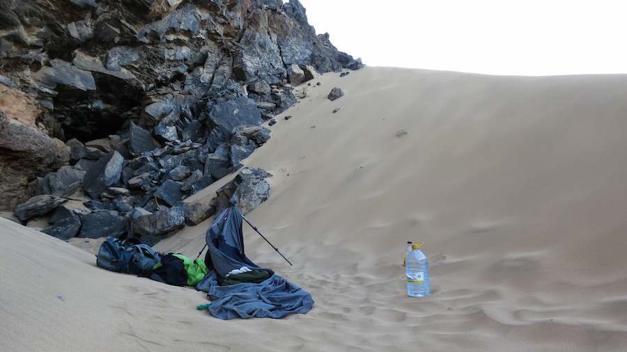 The first night was quite uncomfortable. I found a perfect looking sand dune next to the cliffs. There was a slight chance of getting hit by a loose rock but the location was the best in the bay and it was getting dark quite fast.